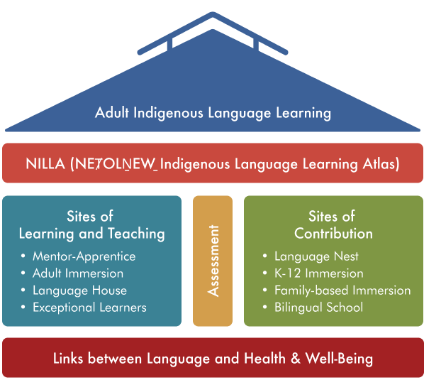Adult learners hold great potential to contribute to the revival of Indigenous languages. Yet, we know that learning languages at any age does not happen in isolation, and so our Partnership uses an approach that engages with — and studies — the multiple contexts in which adult learners both learn and contribute. These study areas are organized into five research themes in our Project House below.